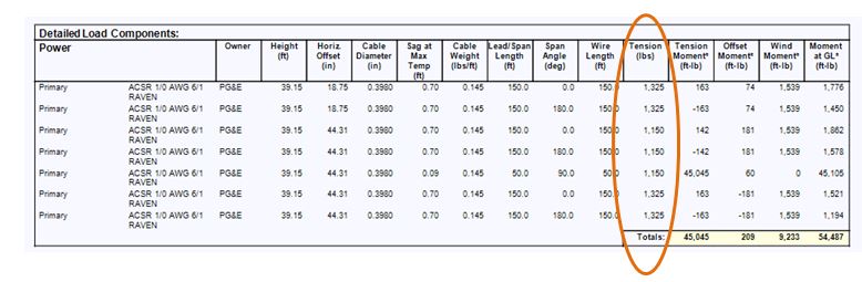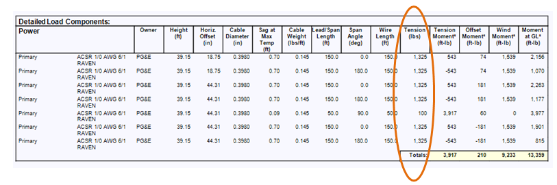 When this third span is attached to the insulator and the line end fitting is set to free, O-Calc equalizes the tensions of all three spans, resulting in the high reading on the capacity display and the pole overturning in some cases. The tension values can be viewed in the report pictured below.