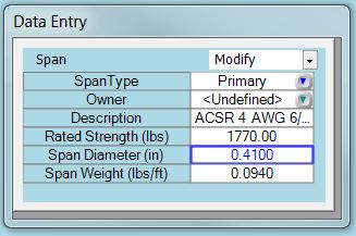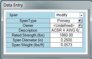 This Data entry window shows the attributes of our original ACSR 4 AWG 6/1 SWAN span. We can modify these attributes using our data table provided by the manufacturer using the following steps:
