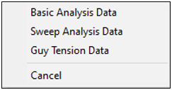 The Export Analysis Data plugin allows you to export the Basic analysis data, Sweep analysis data, or Guy Tension data for the selected (the pole shown in the Inventory) pole model.